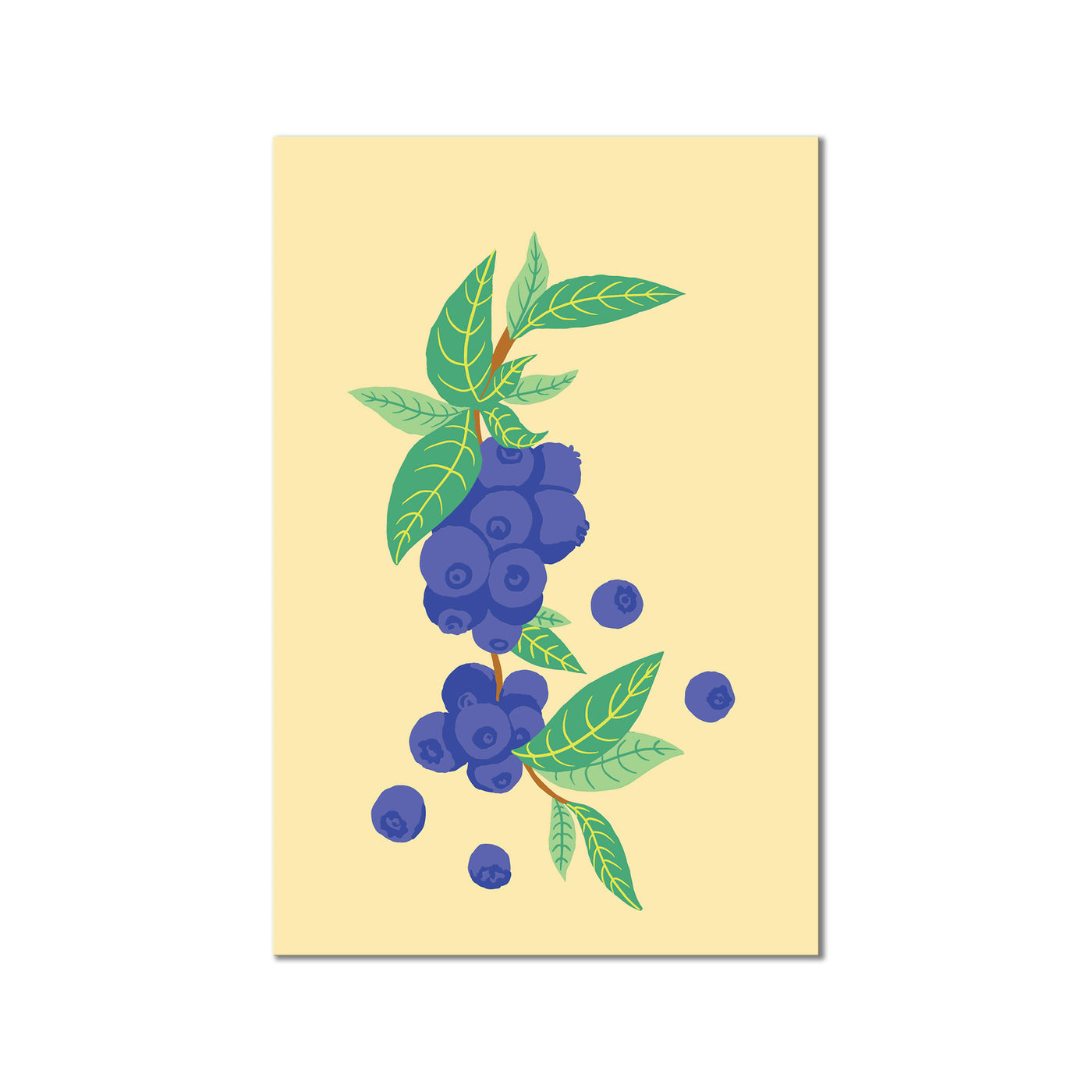 Liven up any interior with this modern botanical artwork, titled 'Sorbet's Special XV' by ChiChi Décor. The vertical artwork features fresh blueberries on a branch with green leaves and a yellow background.